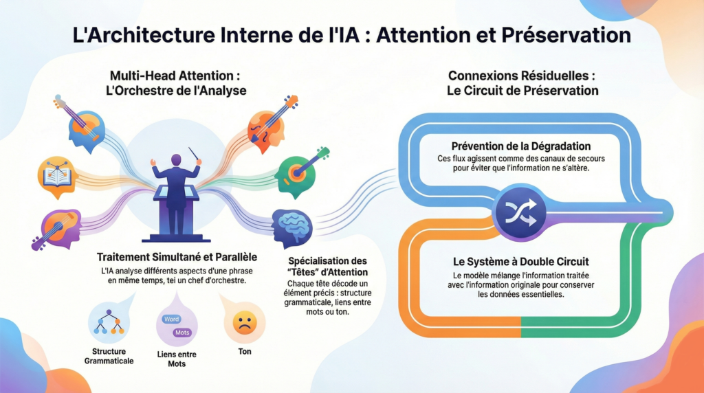 Concept illustré : Architecture (Têtes d’Attention + Flux Résiduels)