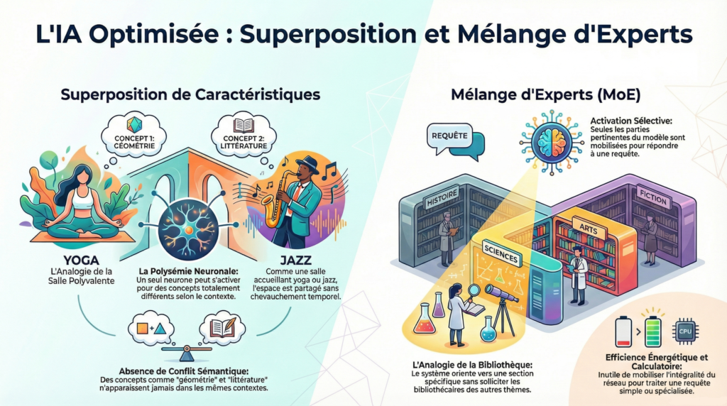 C’est le même espace physique, mais son « activation » correspond à des fonctions complètement différentes car ces usages ne se chevauchent jamais temporellement. Un neurone artificiel exploite cette même logique : il peut représenter « littérature française » ET « géométrie euclidienne » car ces concepts n’apparaissent jamais dans les mêmes contextes de phrase.
