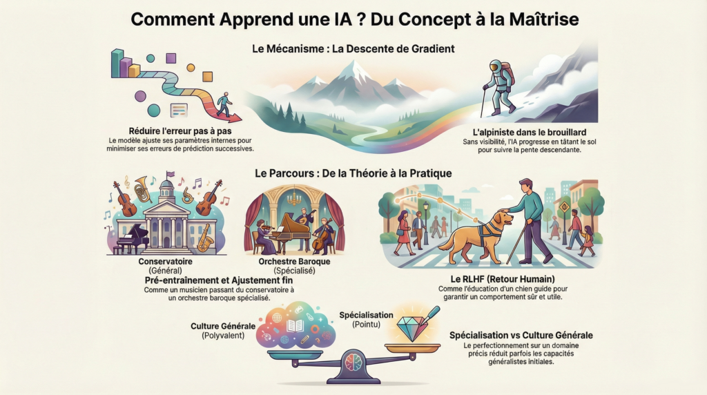 Ce processus, répété des milliers de fois, le mène progressivement vers la vallée même s’il ne voit jamais la destination finale. La descente de gradient fonctionne de façon similaire : le modèle ajuste ses milliards de paramètres par petits incréments, cherchant à chaque étape la direction qui réduit le plus son erreur.