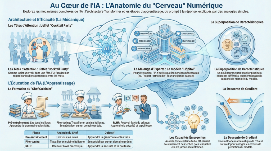 Vous venez d’explorer les rouages internes de l’intelligence artificielle : l’architecture qui permet l’analyse parallèle (têtes d’attention, flux résiduels), les mécanismes d’optimisation (superposition, experts), les trois phases d’éducation (gradient, pré-entraînement, RLHF) et les phénomènes étranges qui émergent à grande échelle.