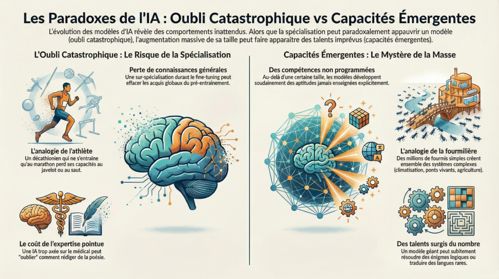 Ses muscles et sa mémoire musculaire se sont réorganisés autour d’une seule discipline, effaçant les compétences qu’il ne pratique plus. Une IA qui apprend trop spécifiquement le vocabulaire médical peut « oublier » comment rédiger de la poésie.