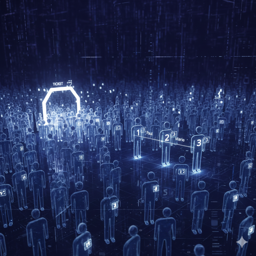 Imaginez une foule de personnes (les mots) qui entrent dans une administration en désordre. Pour rétablir l’ordre de passage, on distribue à chacun un ticket numéroté à l’entrée.