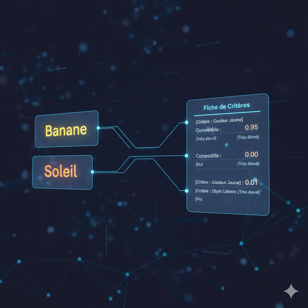 Grâce à cette fiche commune, l’IA « voit » mathématiquement que la Banane et le Soleil sont des « cousins » sur l’axe de la couleur, même s’ils sont opposés sur l’axe de la nourriture.